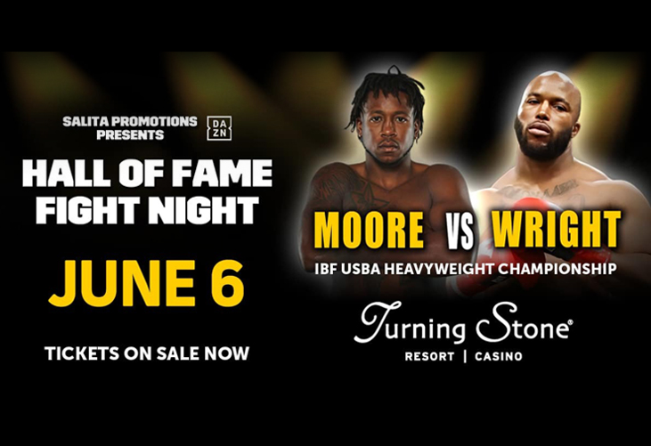 Oneida Indian Nation Homelands (May 5, 2025) – Salita Promotions will present an electrifying night of fights on Friday, June 6, at the Turning Stone Resort Casino in Verona, NY, as part of International Boxing Hall of Fame Induction Weekend. This highly anticipated event, titled "Hall of Fame Fight Night," will be broadcast live worldwide on DAZN and is promoted in collaboration with ALL THE SMOKE FIGHT, the dynamic digital content platform led by boxing legend Andre Ward.