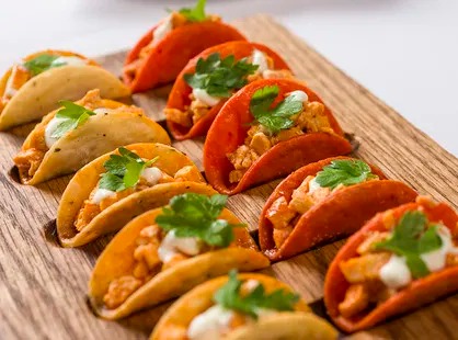 - Buffalo Chicken Tacos with Blue Cheese Crumbles and Micro Celery