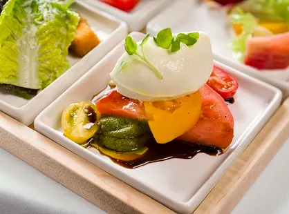 - Heirloom Tomato Salad – Heirloom Tomato, Burrata Cheese, Basil Coulis, Sicilian Olive Oil, Aged Balsamic