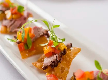 - Sliced Seared Sirloin on a Wonton Crisp with Tomato, Ginger Salsa